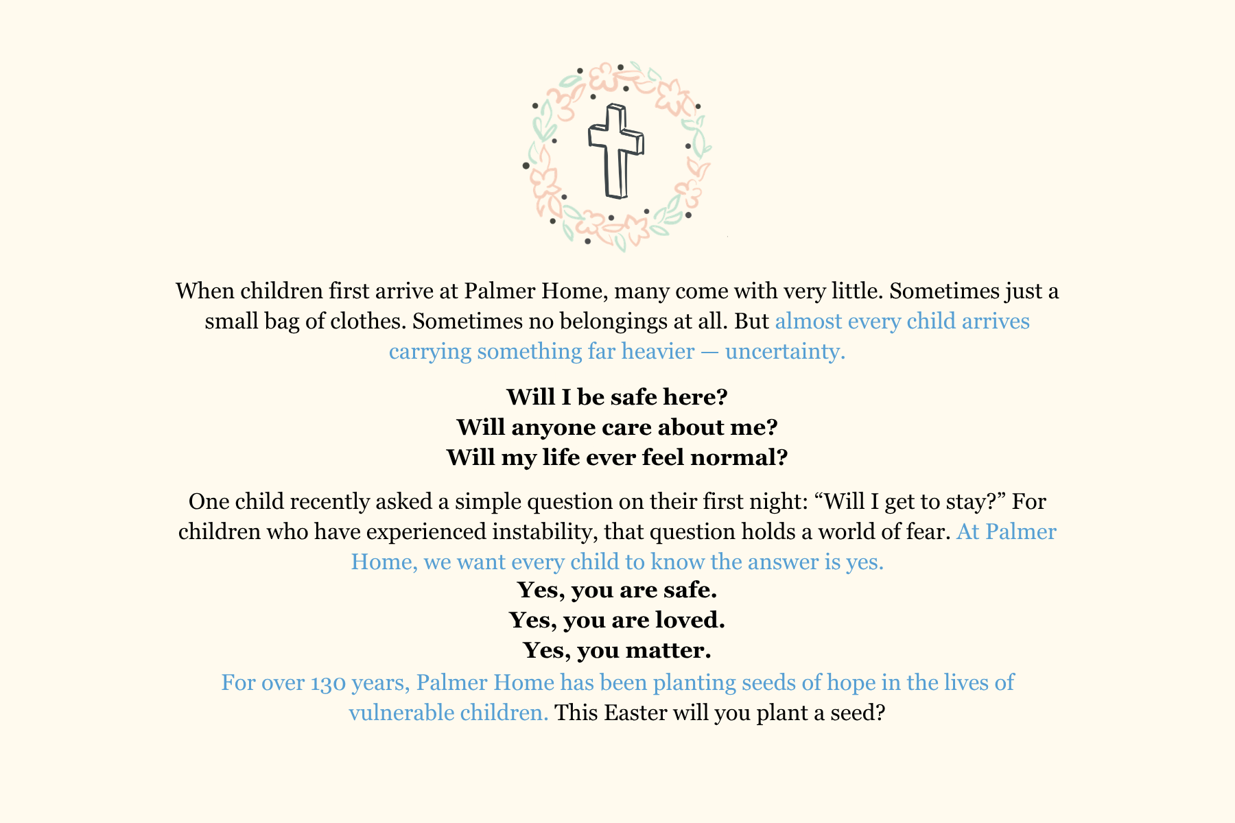 What if hope could start with you this Easter? Easter reminds us that even after the darkest moments, new life is possible. Your gift today helps children at Palmer Home discover that their story is not over — and that hope is still growing.